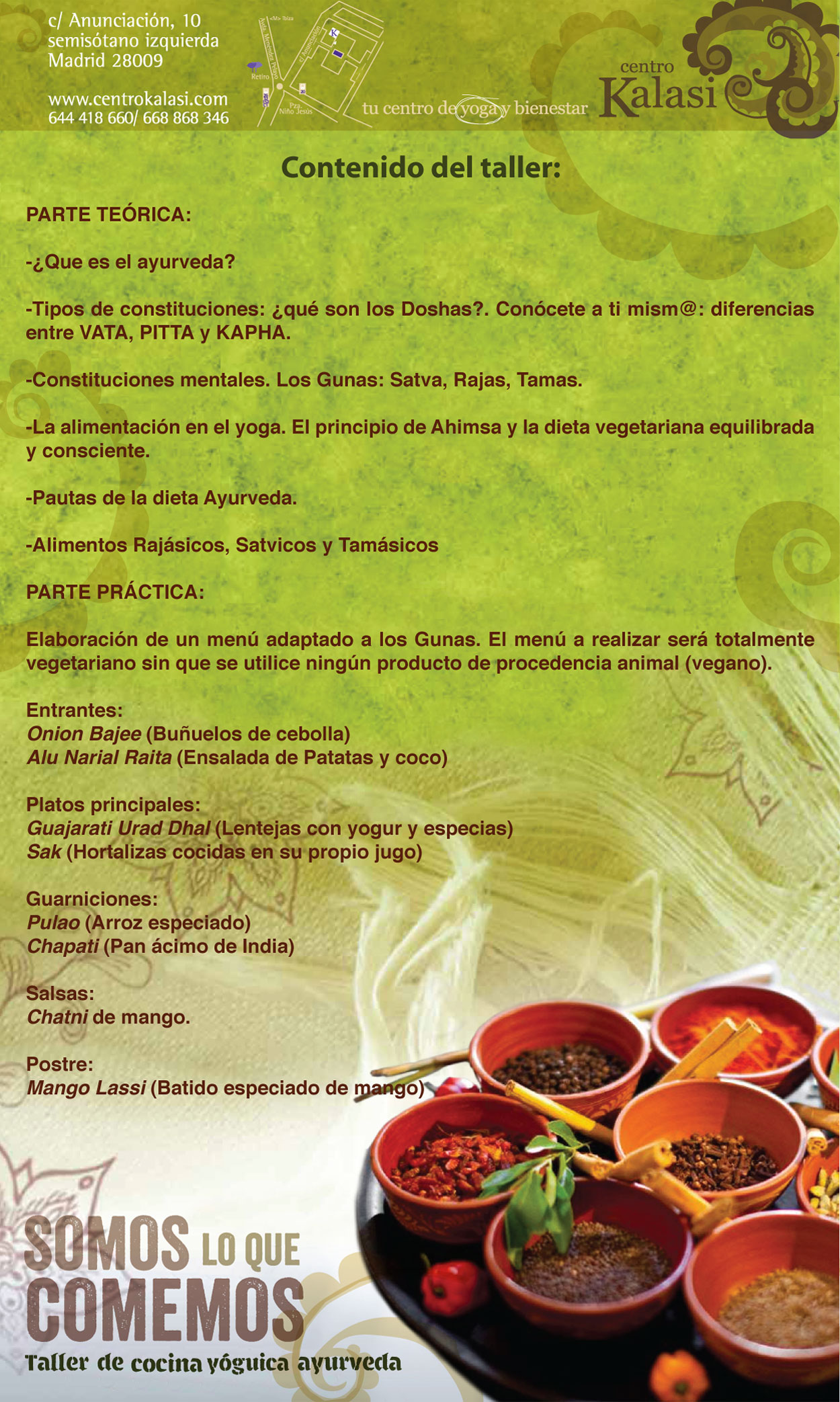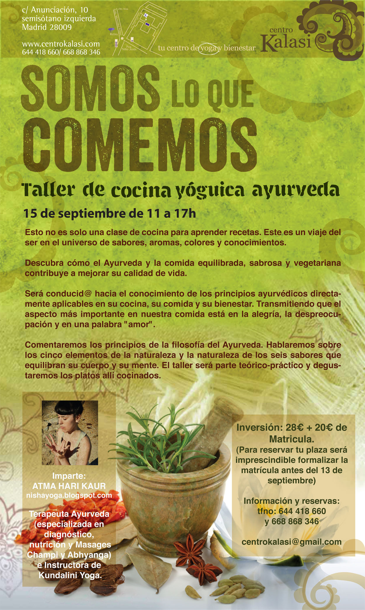 a la vuelta del verano en madrid, aparte de volver con ganas a las clases regulares de yoga, este otoño estamos felices de poder daros la oportunidad de tener otras experiencias nuevas en el barrio del retiro: como esta de darte el gusto de conocer la conexión entre la nutrición, el cuerpo y la mente en el taller de cocina yóguica ayurveda este 15 de septiembre. no esperes más, ¡apúntate ya!